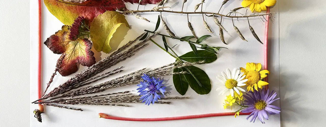 - Natural materials: Collect leaves, flowers, twigs, pine cones, feathers, seeds, and other items from your garden, local park, or countryside – make sure you have permission before picking any flowers or leaves.